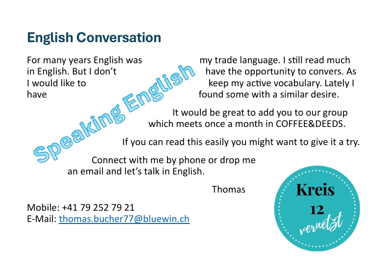 Willkommen bei "Vernetzt in Schwamendingen "! Wir sind ein partizipativ ausgerichtetes Projekt, das Vernetzung und Aktivitäten von älteren Quartierbewohnenden fördert. Wir bieten ein Gefäss für sozialen Austausch, Koordination und Planung von Begegnungsangeboten und sind bestrebt Wohlbefinden, Wissensaustausch und soziale Teilhabe im Pensionsalter zu fördern. Bei uns sind Ideen und Mitarbeit von Freiwilligen und Interessierten herzlich willkommen.